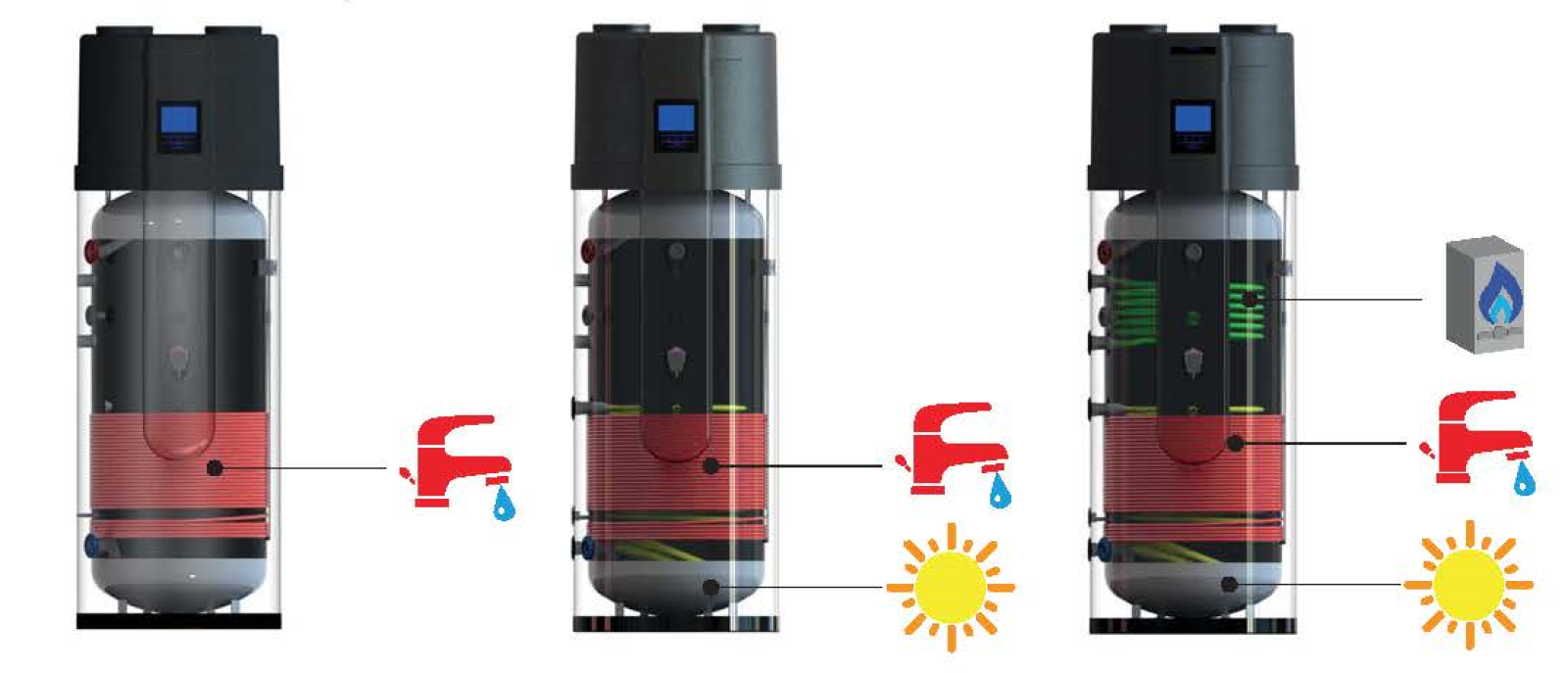 La pompa di calore ha una potenza massima di 500 Watt (1/4 di un asciugacapelli) e garantisce fino a 300 litri di Acqua Calda Sanitaria.