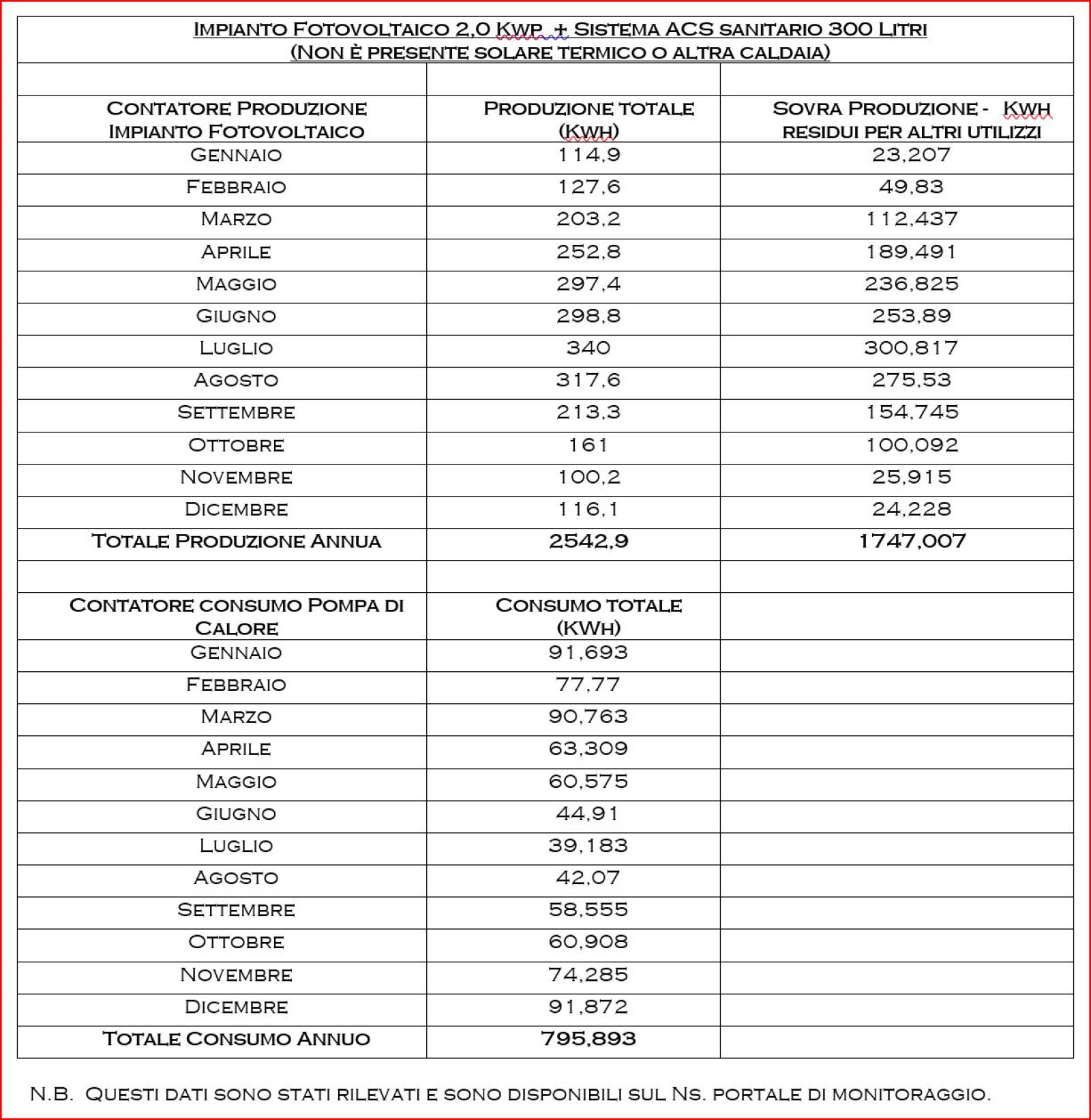 Di Seguito riportiamo una tabella che è stata estratta da un Ns. impianto realizzato e monitorato. (L’impianto è per una villetta di n° 2 piani con un nucleo familiare di 5 persone)